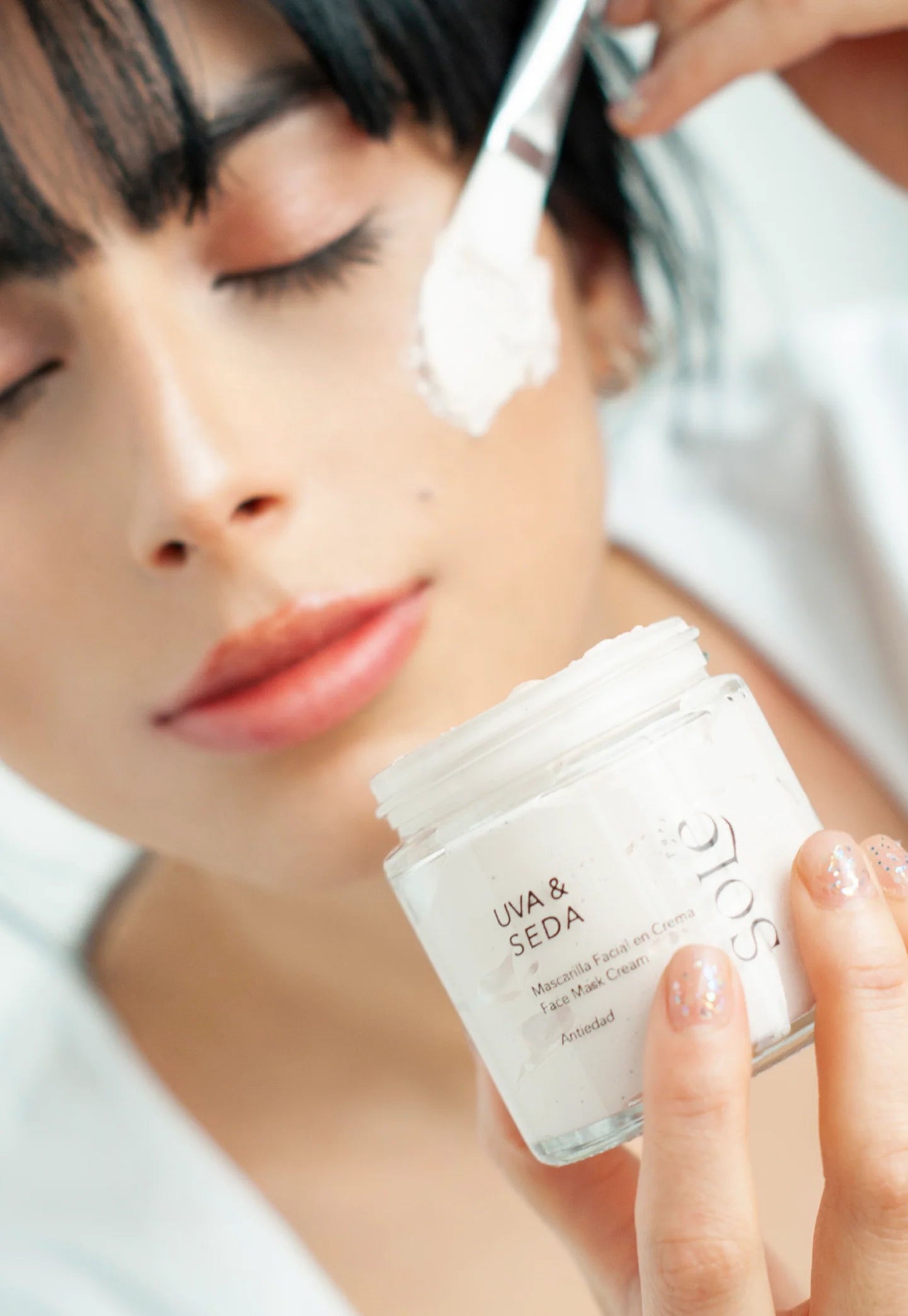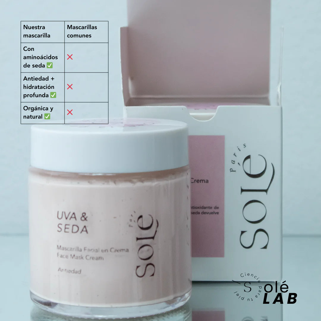 Mascarilla Orgánica formulada con ácido hialurónico, aminoácidos de seda y concentrado de uva pura que le confieren propiedades Antiedad, antienvejecimiento, hidratantes, reparadora y emolientes. Mejora el aspecto de las lineas finas de expresión.
