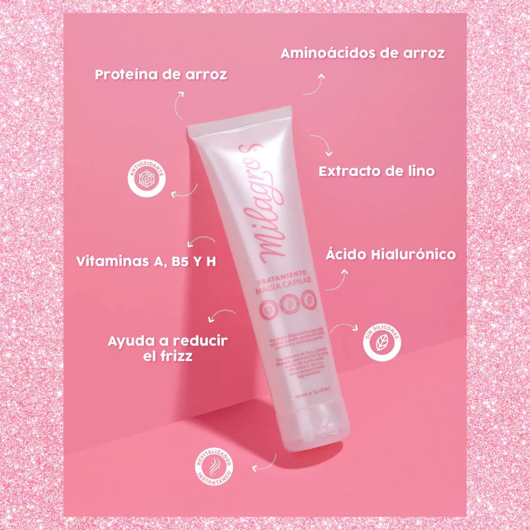 El tratamiento magia capilar es un tratamiento sin enjuague que le brinda al cabello un GLOW UP inmediato mientras que fortalece y repara, potencializado con todo el poder del ácido hialurónico que actúa sobre el cabello aportando extra brillo, suavidad y revitalizando las puntas de manera instantánea.